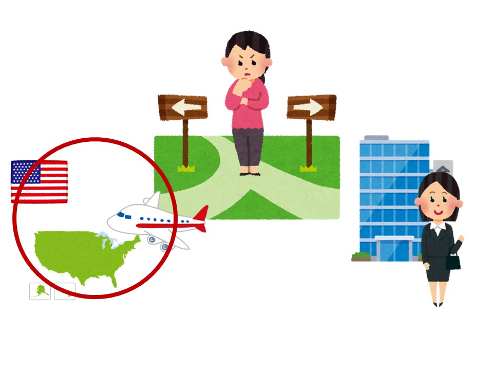 T:女の人は今、大学生です。卒業後、アメリカへ留学するべきか、それとも就職するべきか悩んでいます。長い時間考えました。そして、決めました。