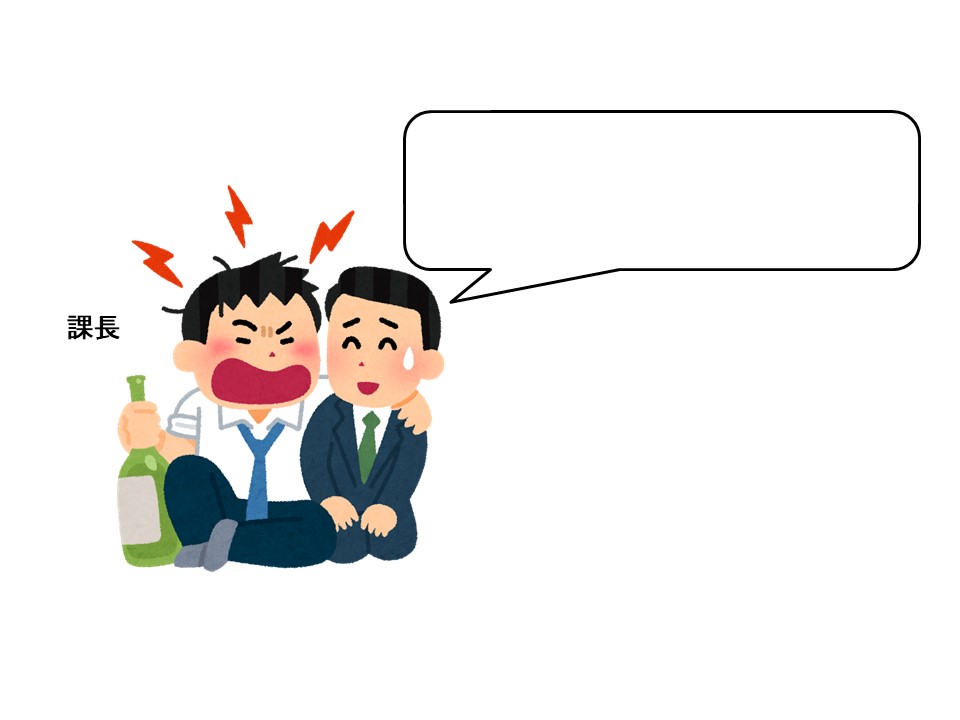 T:会社の飲み会です。課長は酒癖が悪いです。お酒を飲むと、騒ぎ始めます。部下はとても困っていますね。