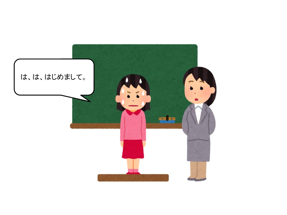 T:女の子は新しい学校に転校しました。今日は初登校の日です。クラスメートの前で自己紹介をしますが、とても緊張しているので、うまく話せませんでした。