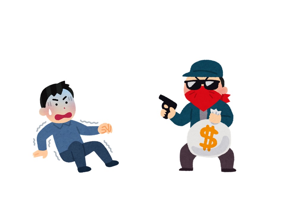 T:男性は銀行でお金を下ろそうとしていました。すると、そこにいきなり銀行強盗が現れました。