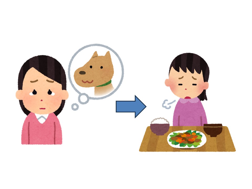 T:女性はつい最近、愛犬を病気で亡くしました。とても悲しいです。とても悲しいので、食事も喉を通りません。