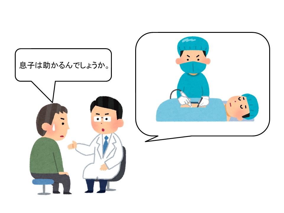 T:先生と患者の父親が話しています。息子さんは病気が見つかって、手術をしました。とても大きな手術でした。お父さんは息子が助かるかどうかとても心配しています。先生は自分ができる限りのことをしました。ですから、あとは祈るしかありません。