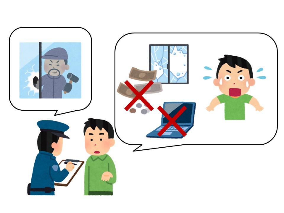 T:男性が警察と話しをしています。男性の家に泥棒が入ったようです。窓ガラスが割れていて、お金もノートパソコンもなくなっていました。泥棒はどこから入ったと思いますか。