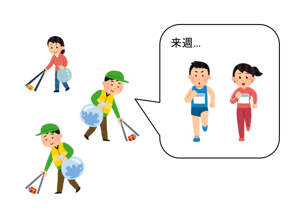 T:来週マラソン大会が開催されます。町の中で行われるので、大会関係者がゴミ拾いをしています。