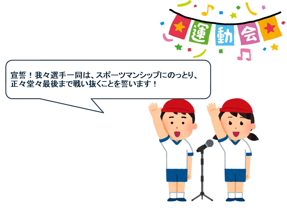 T:これは小学校の運動会です。今、開会式の最中です。運動会を始める前に開会式が行われますが、そこで生徒による選手宣誓があります。