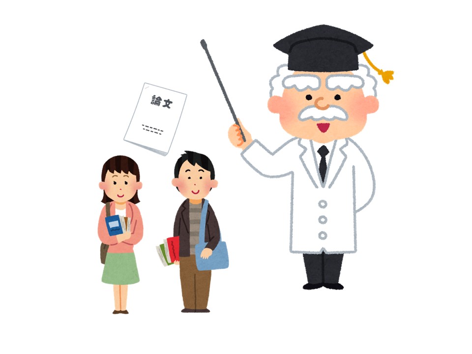 T:まりこさんとたろうさんは大学生です。今、論文を書いています。論文を書くとき、指導をしてくれる教授がいますね。2人は田中教授といっしょに論文を執筆しています。