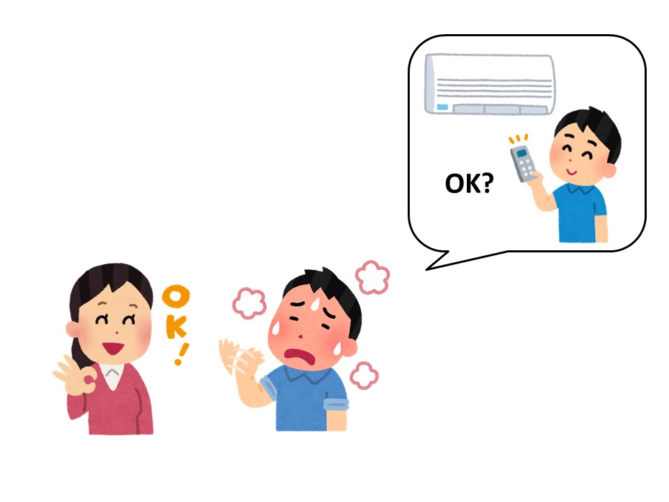 T:あ~、とても暑いです。エアコンをつけたいです。聞きます。