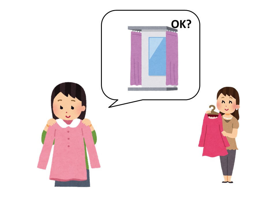 T:服屋にいます。かわいいワンピースがあります。サイズはどうですか?デザインはいいですか?試着室/フィッティングルームで着たいです。店員さんに聞きます。試着室/フィッティングルームを使ってもいいですか。