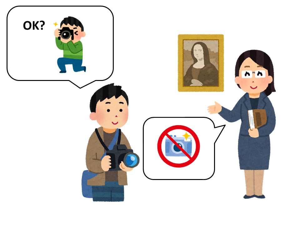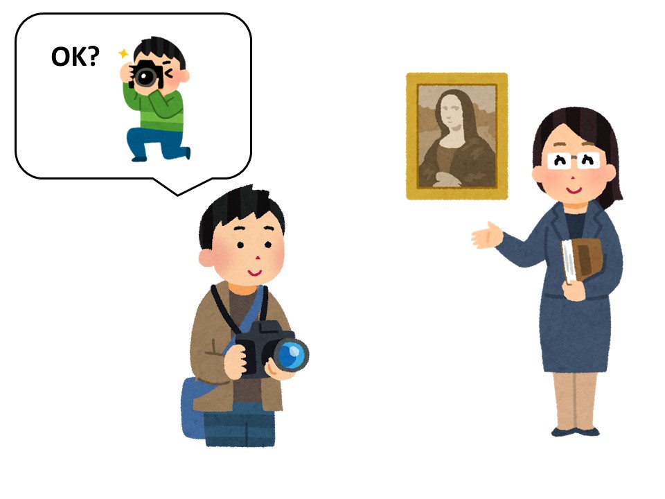 T:ここは美術館です。写真を撮りたいです。いいですか?わかりません。聞きます。