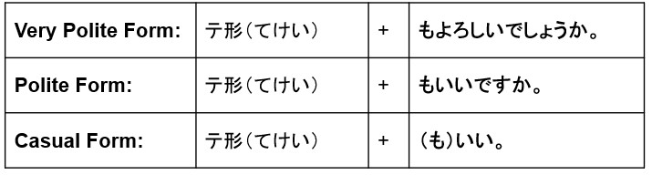 ・学習者に余裕があれば、許可を求める文型は丁寧さに応じて3つの言い方があることも教えてもいいと思います。アニメやマンガが好きな学習者さんは普通体の言い方にけっこう慣れてる方が多いので、案外すんなり導入できたりします。導入する場合は、場面設定を明確に。