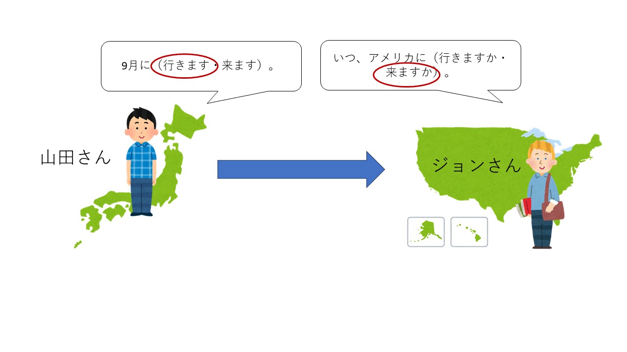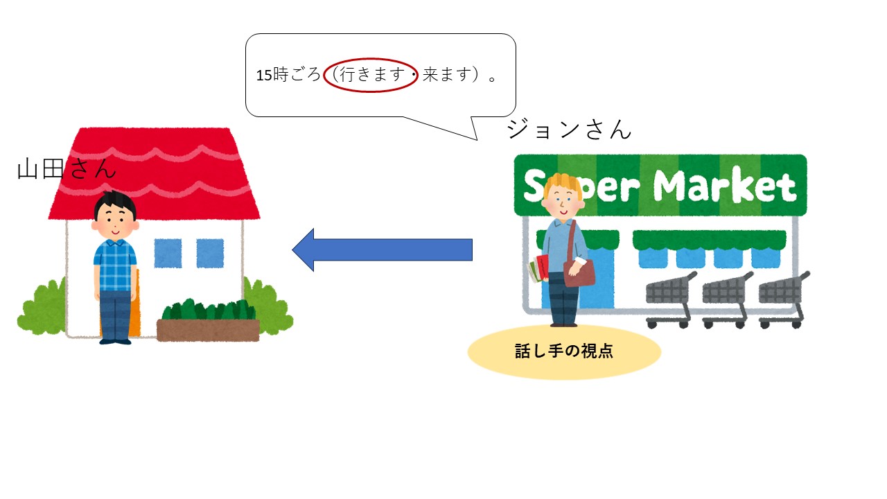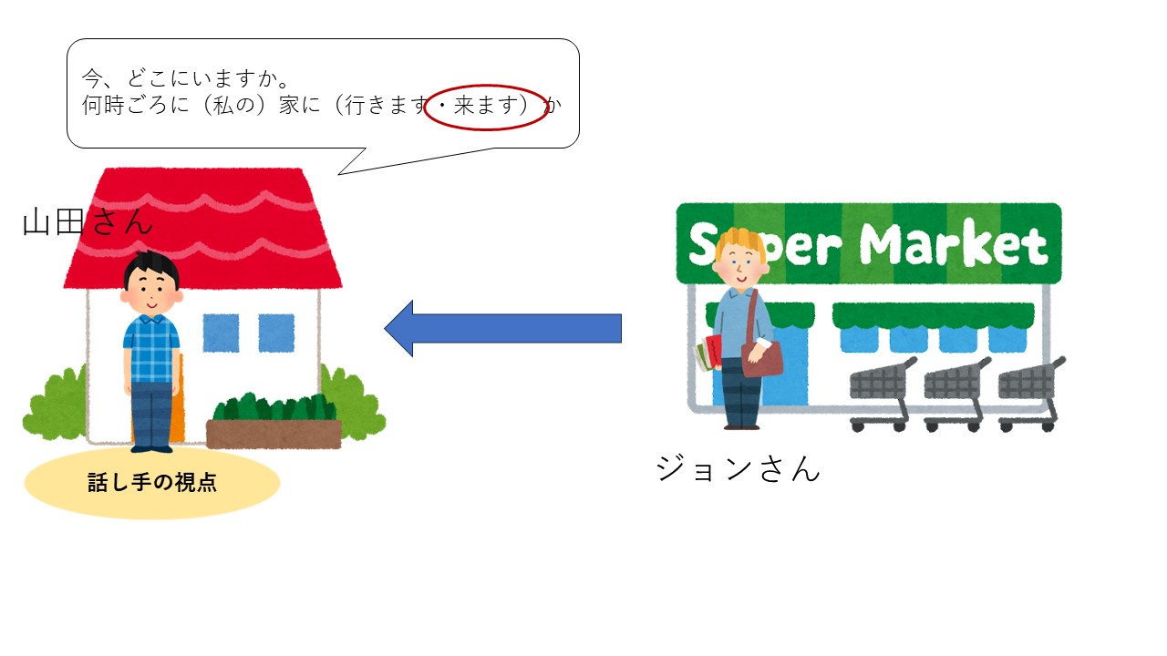 学習者には、話し手が今どこにいるのかを考えさせてることが大切です。