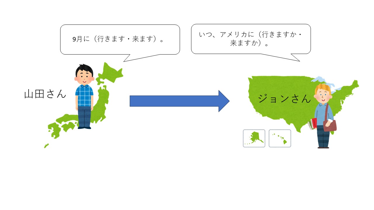 一方、日本にいる山田さんは9月に日本を離れてジョンさんの住んでいるアメリカへ移動します。今いる場所から離れるので、「行きます」となります。