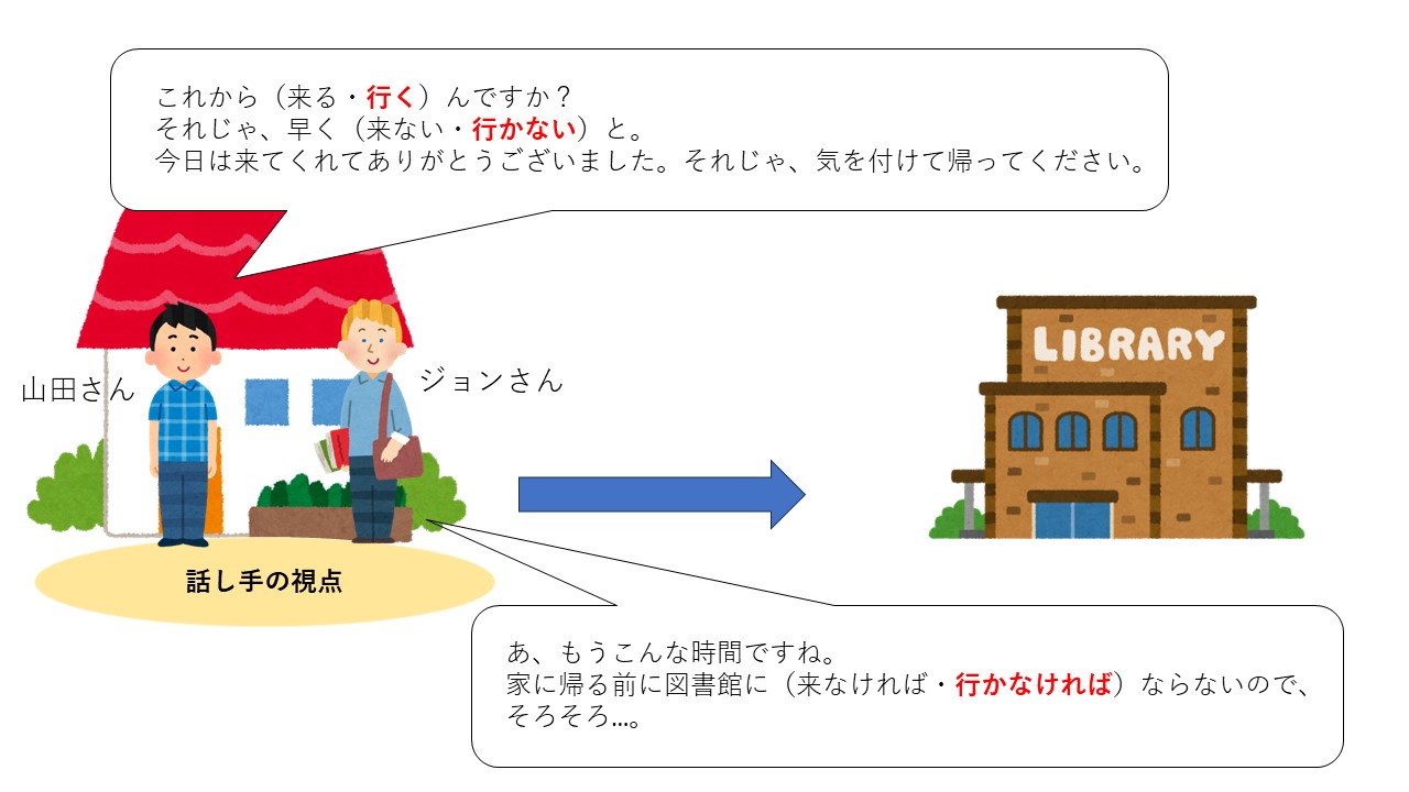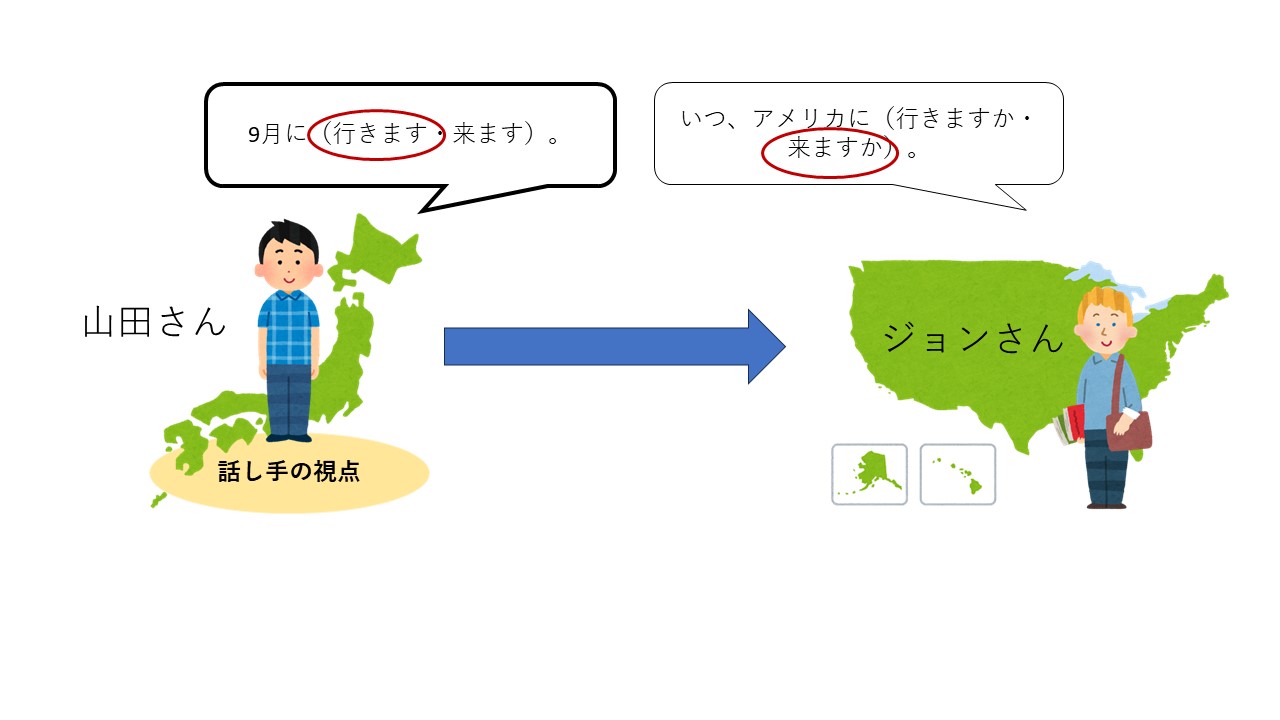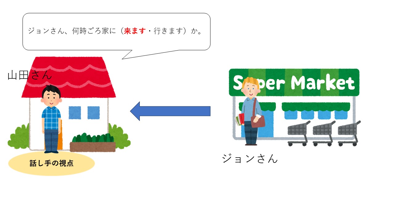日本語の世界では「行く」と「来る」の使う際に、話し手が今どこにいるのかを考えなければなりません。ここでの話者は山田さんです。山田さんは今自宅にいて、ジョンさんにいつ家に来るのかを聞いています。