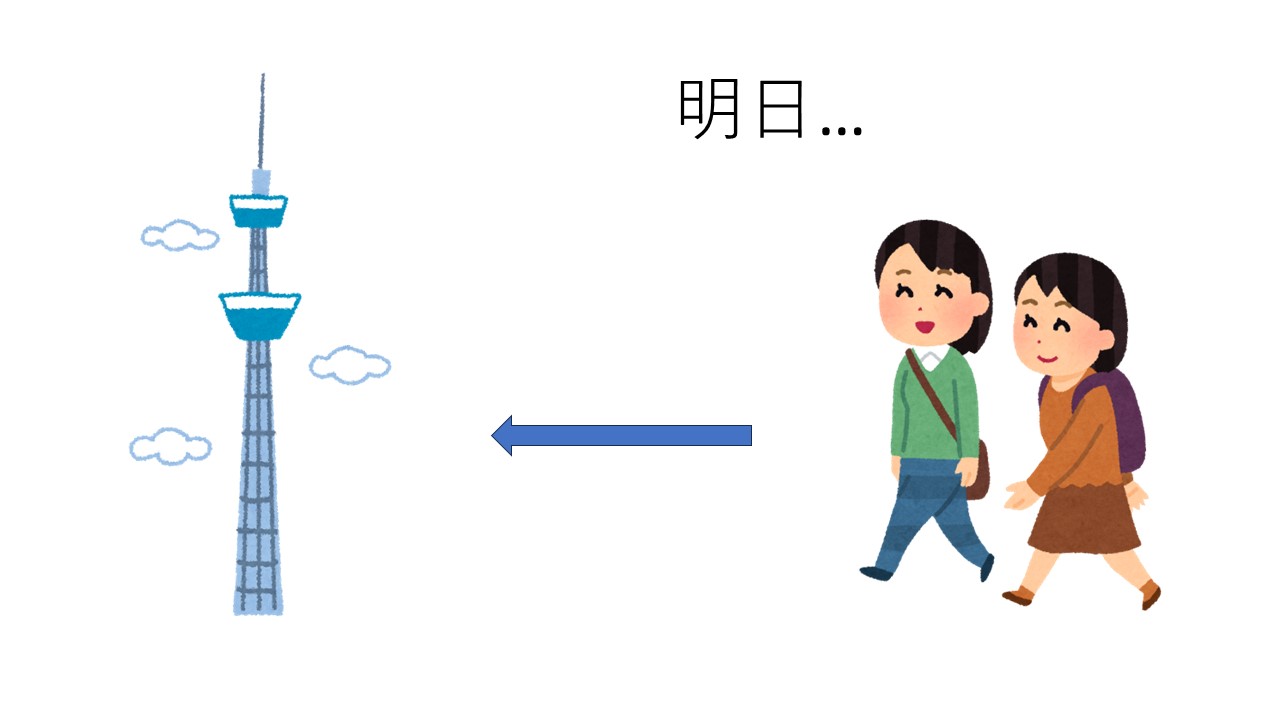 T:そうですね。明日私は東京スカイツリーへ行きます。これは友達です。私は友達と東京スカイツリーへ行きます。