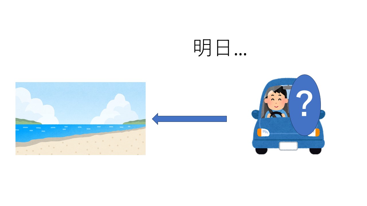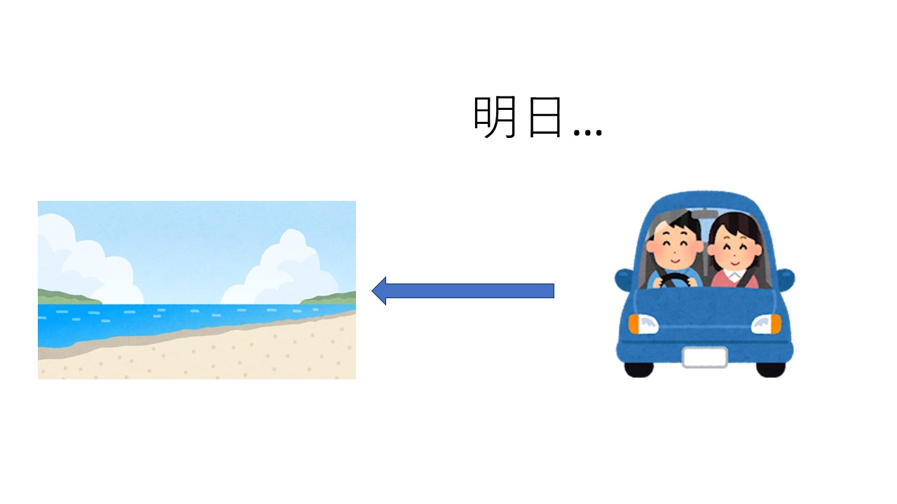 S:ビーチへ行きます。車でビーチへ行きます。
