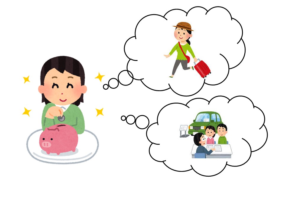 T:そうですね。旅行のために、貯金します。新しい車を買うために貯金します。
